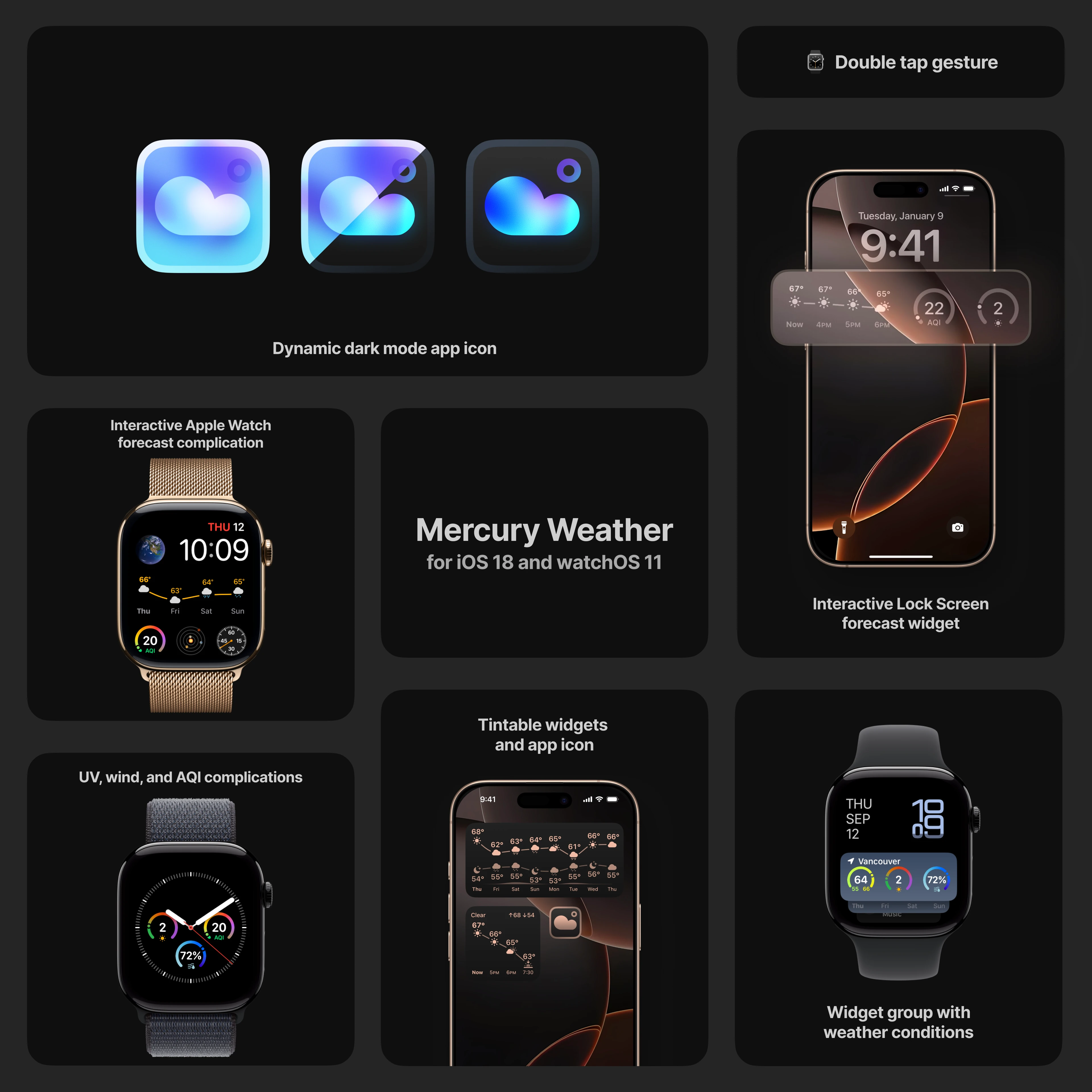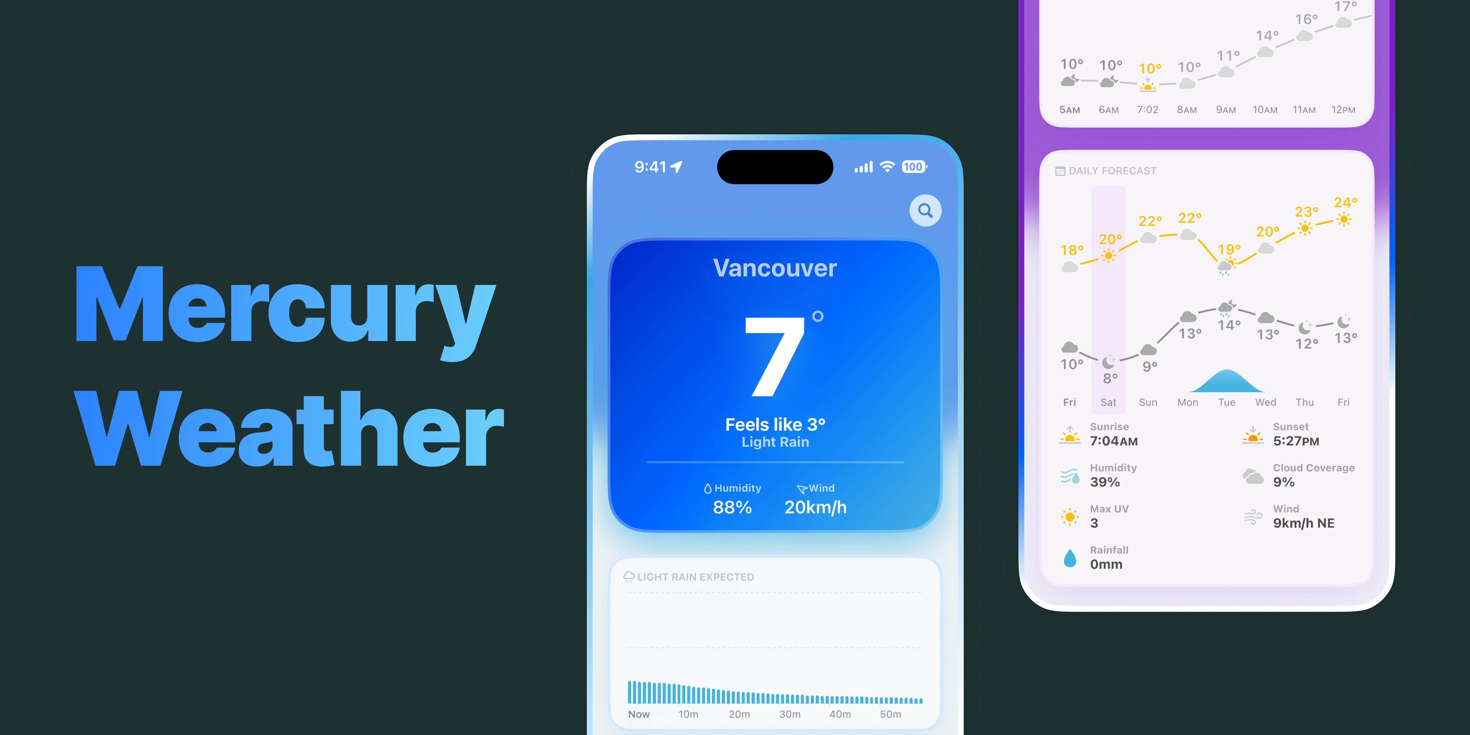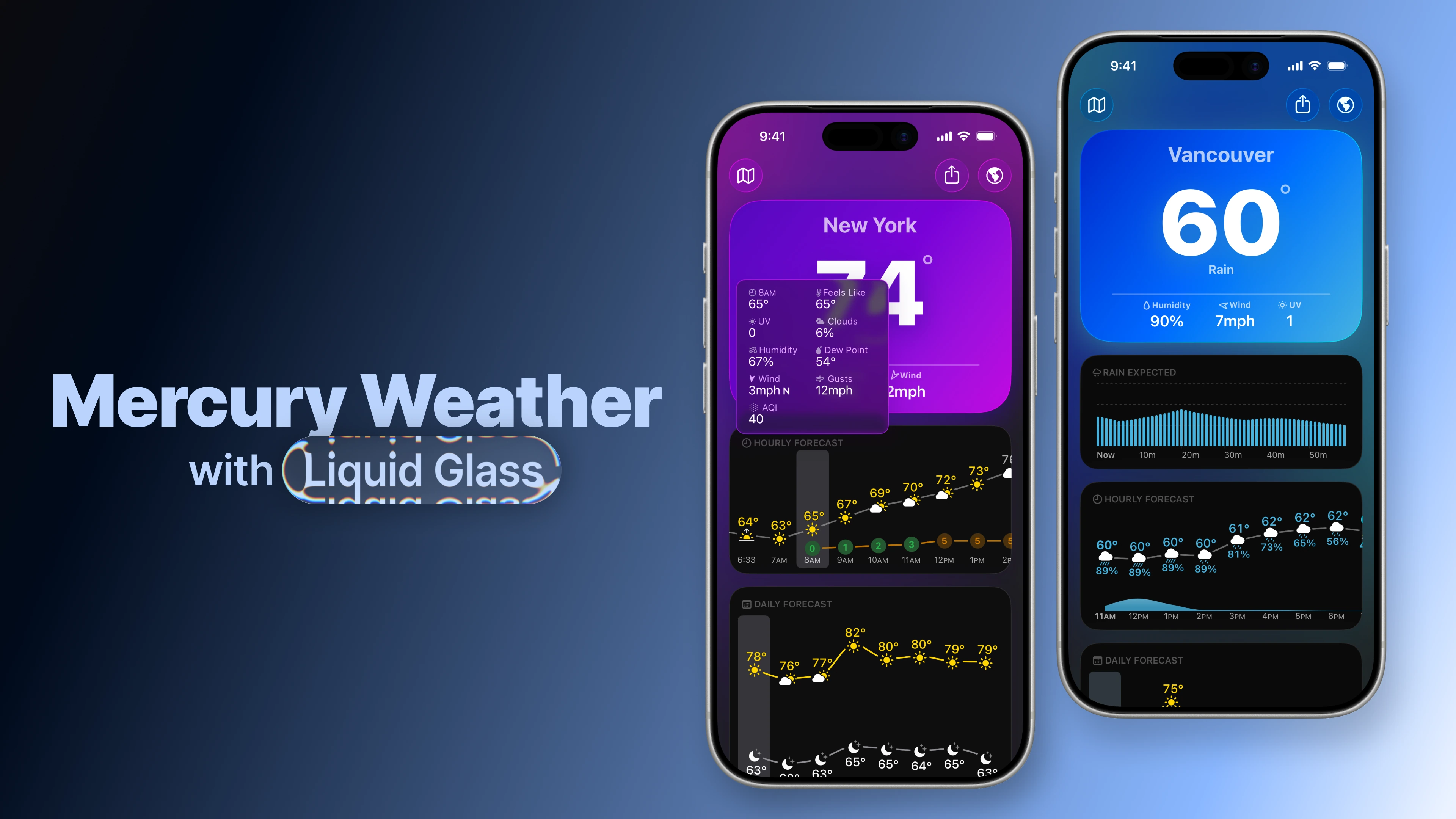 - Liquid Glass Design Refresh: Mercury Weather embraces the new design language introduced in iOS 26. This refreshed design incorporates Liquid Glass in navigation bars, buttons, and overlays and adds specular highlights to our weather cards. We've also updated the app icon to fit right in.