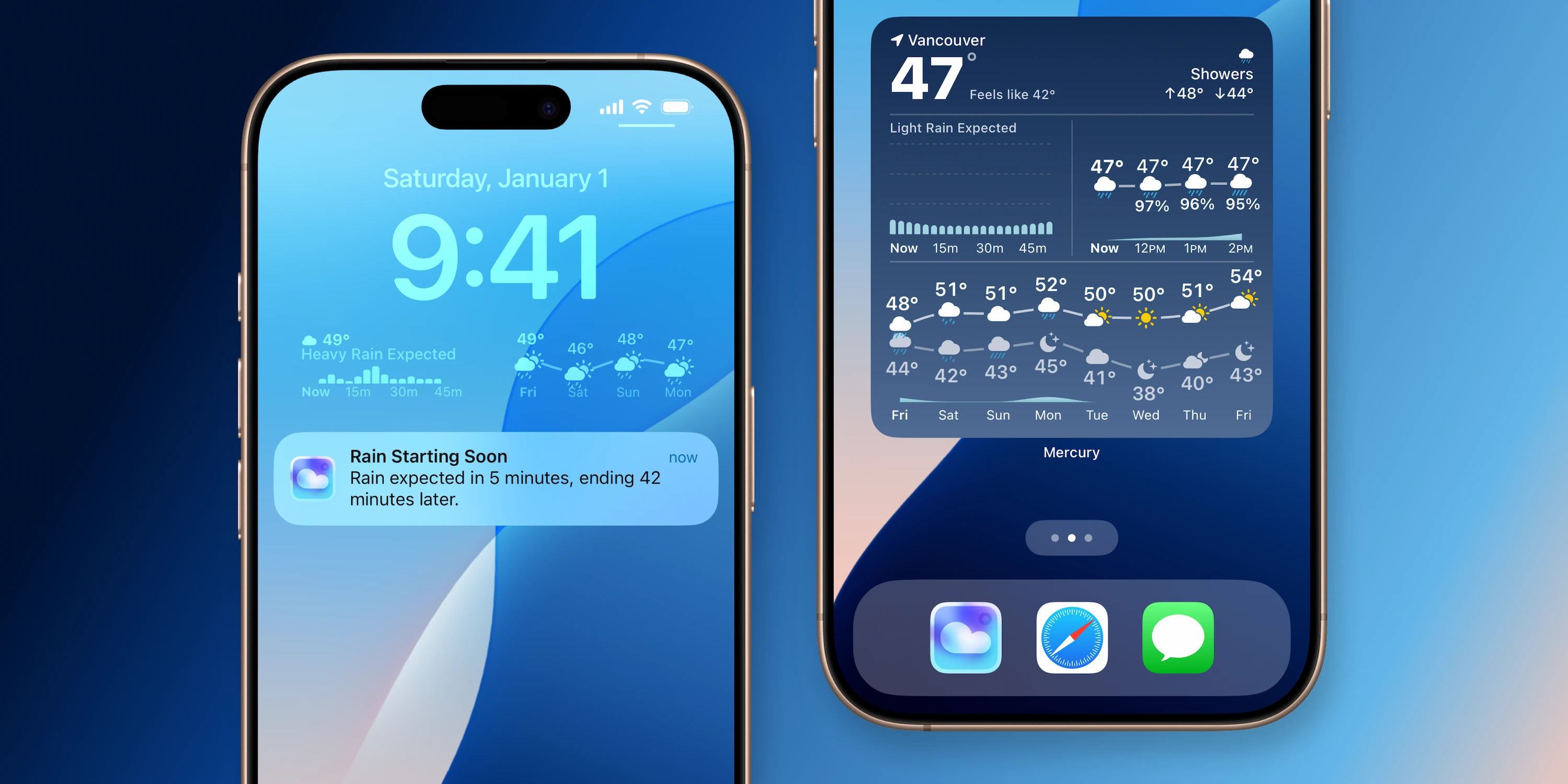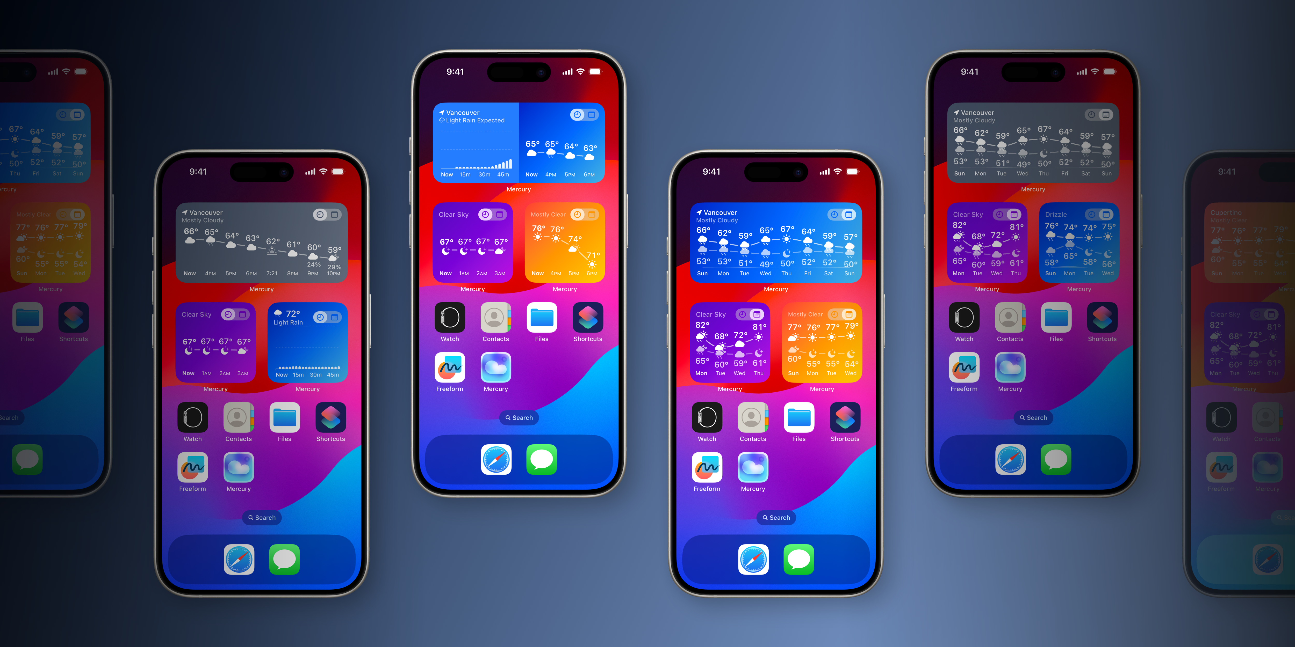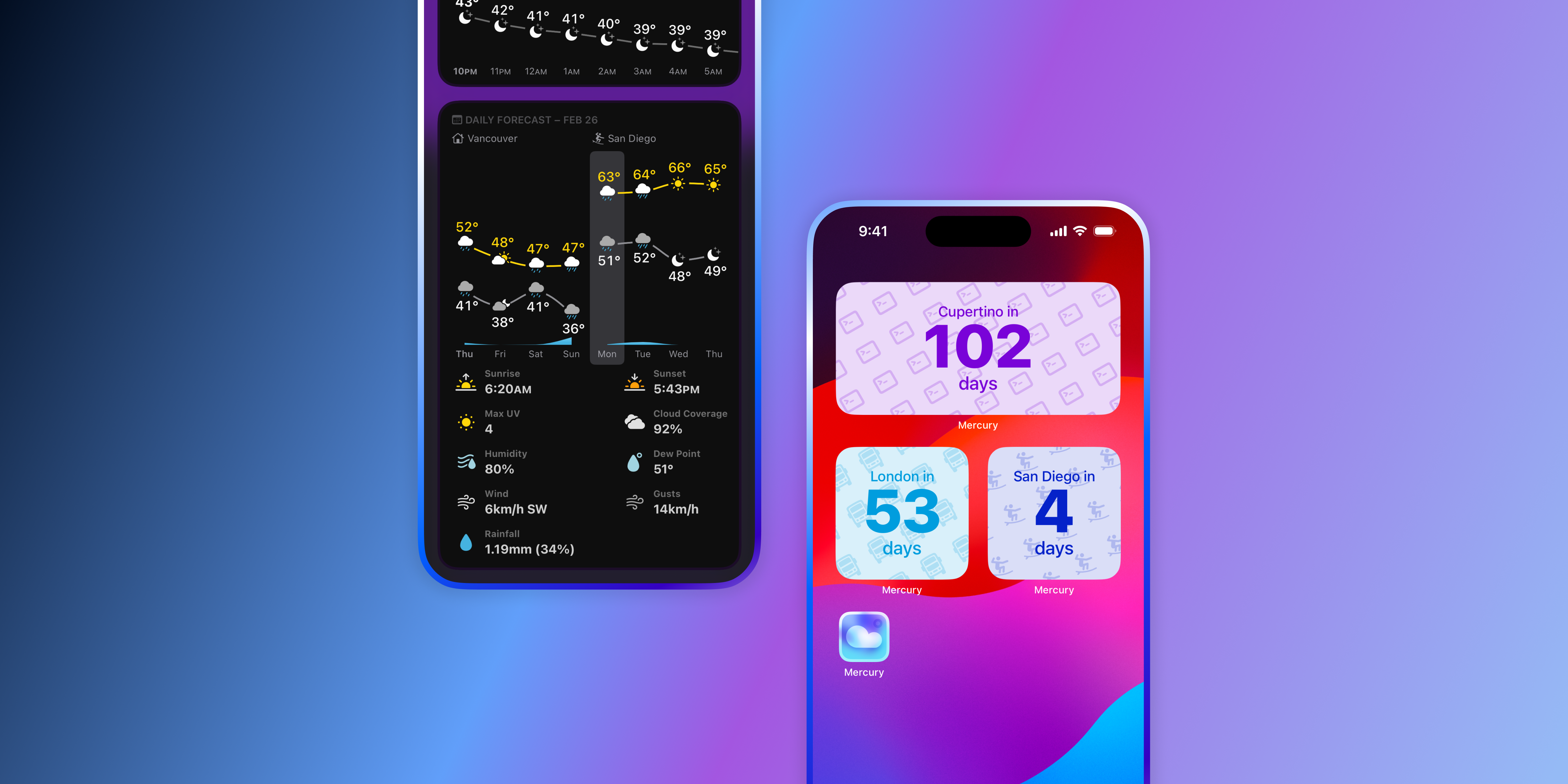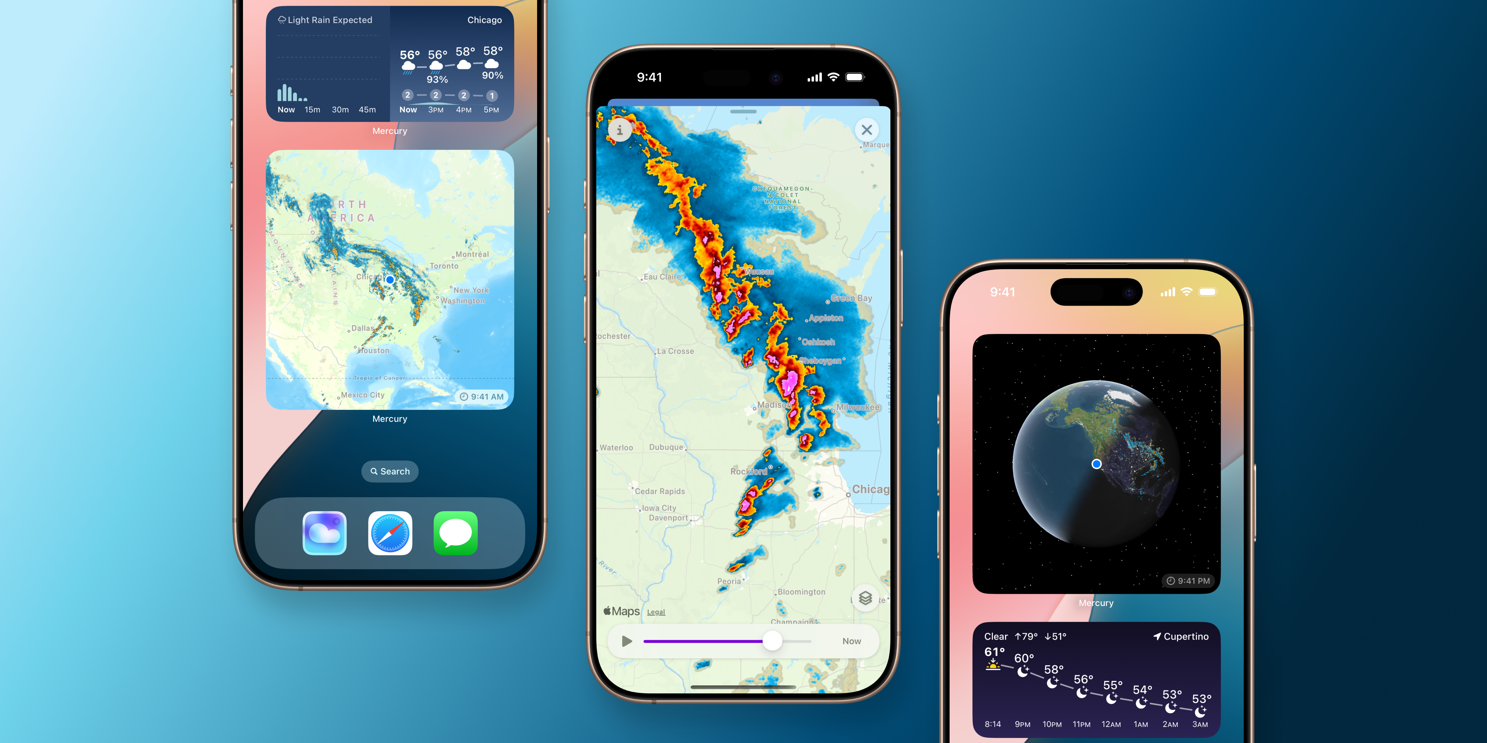 - Liquid Glass Design Refresh: Mercury Weather embraces the new design language introduced in iOS 26. This refreshed design incorporates Liquid Glass in navigation bars, buttons, and overlays and adds specular highlights to our weather cards. We've also updated the app icon to fit right in.