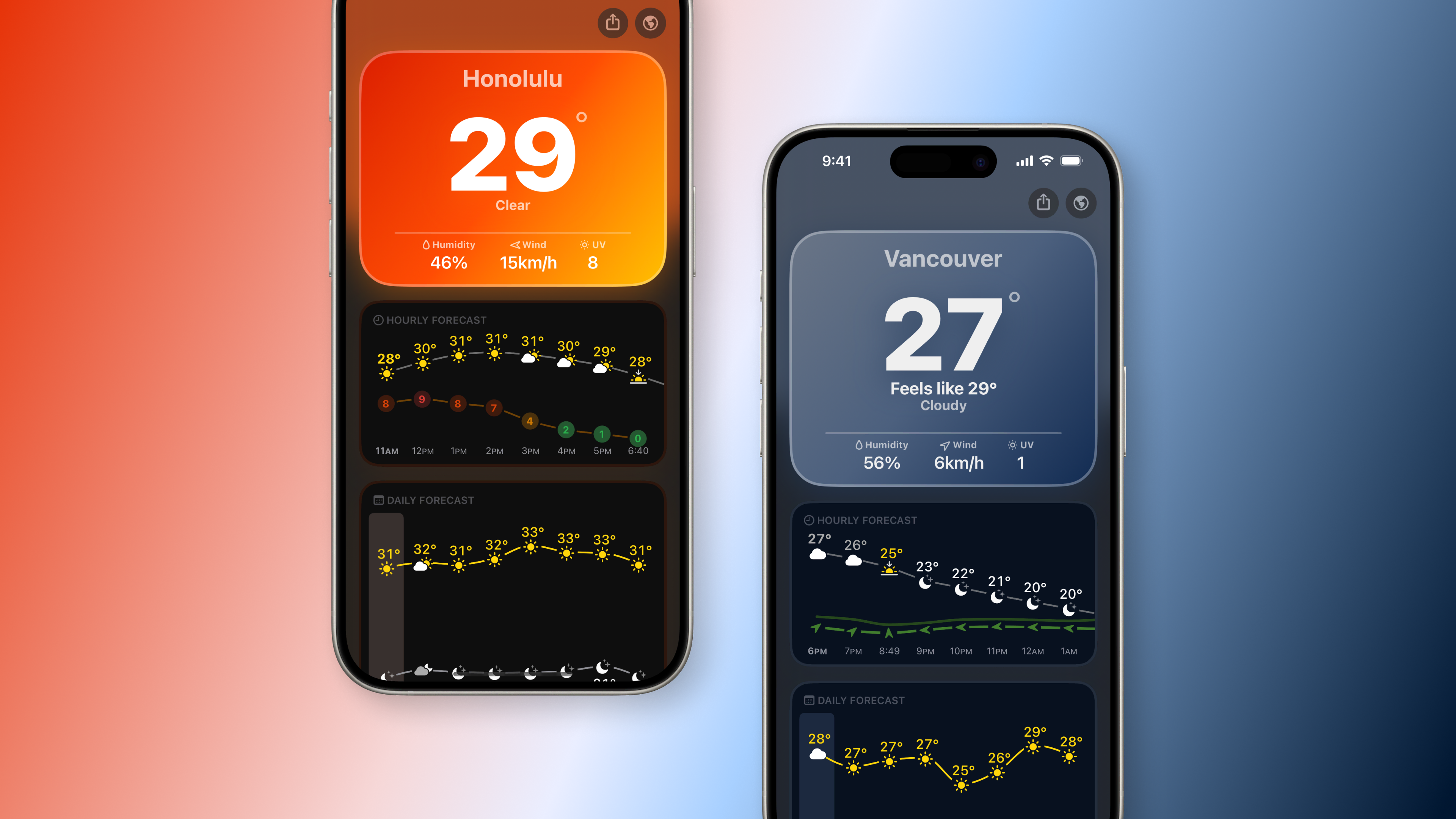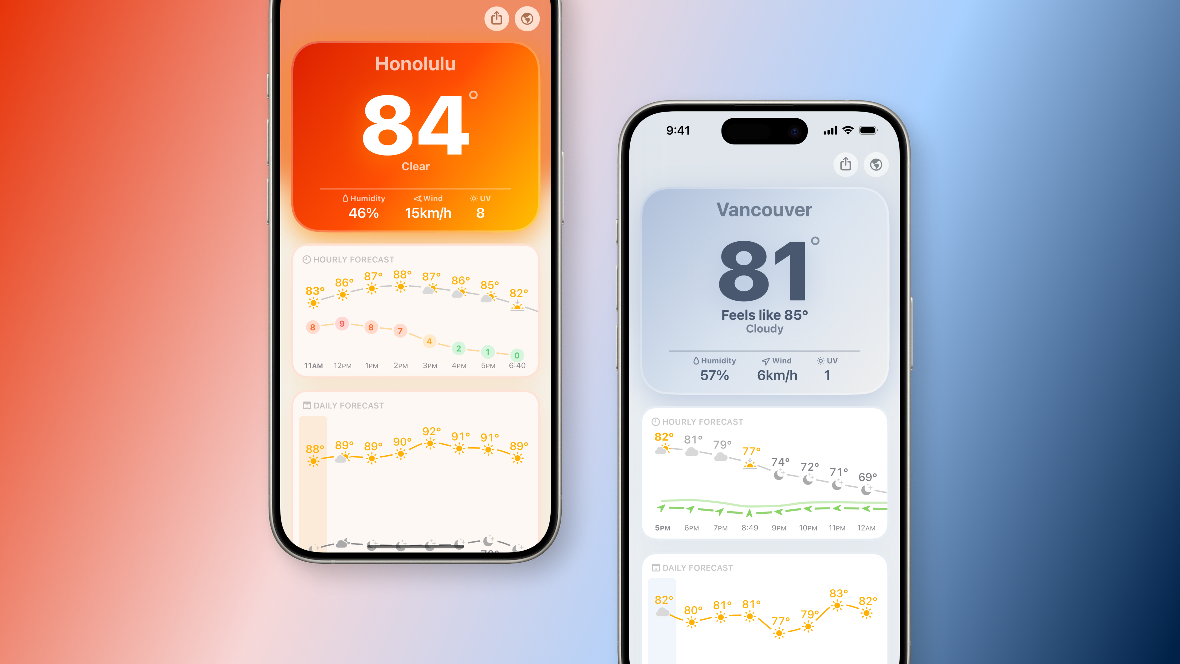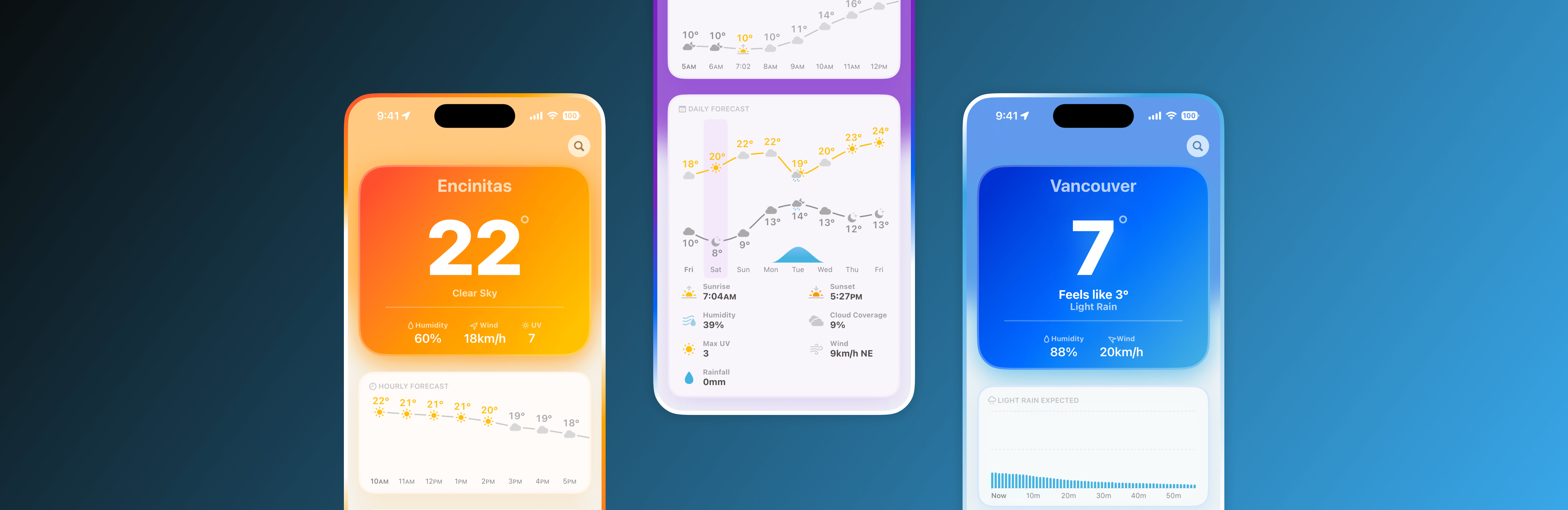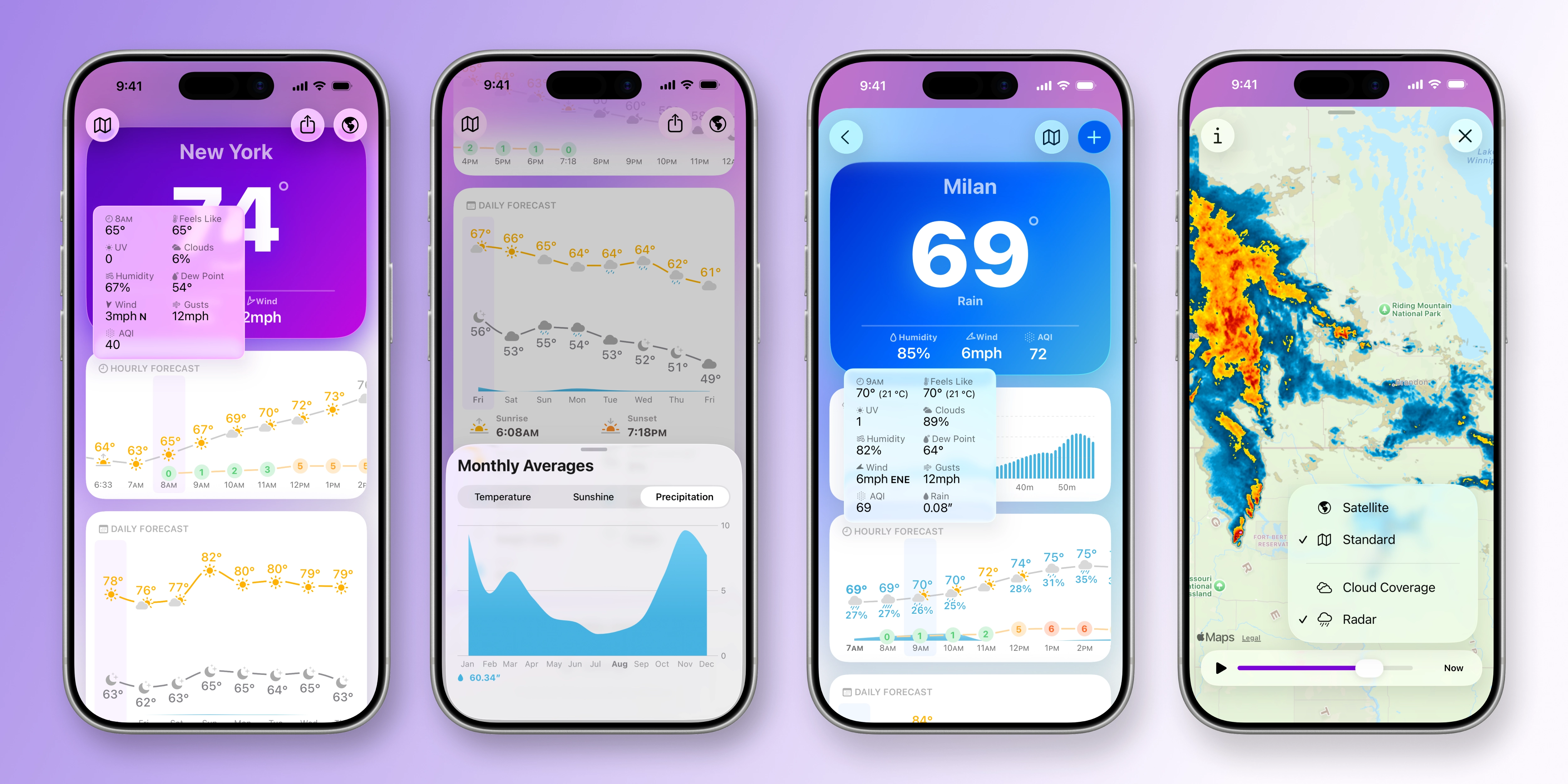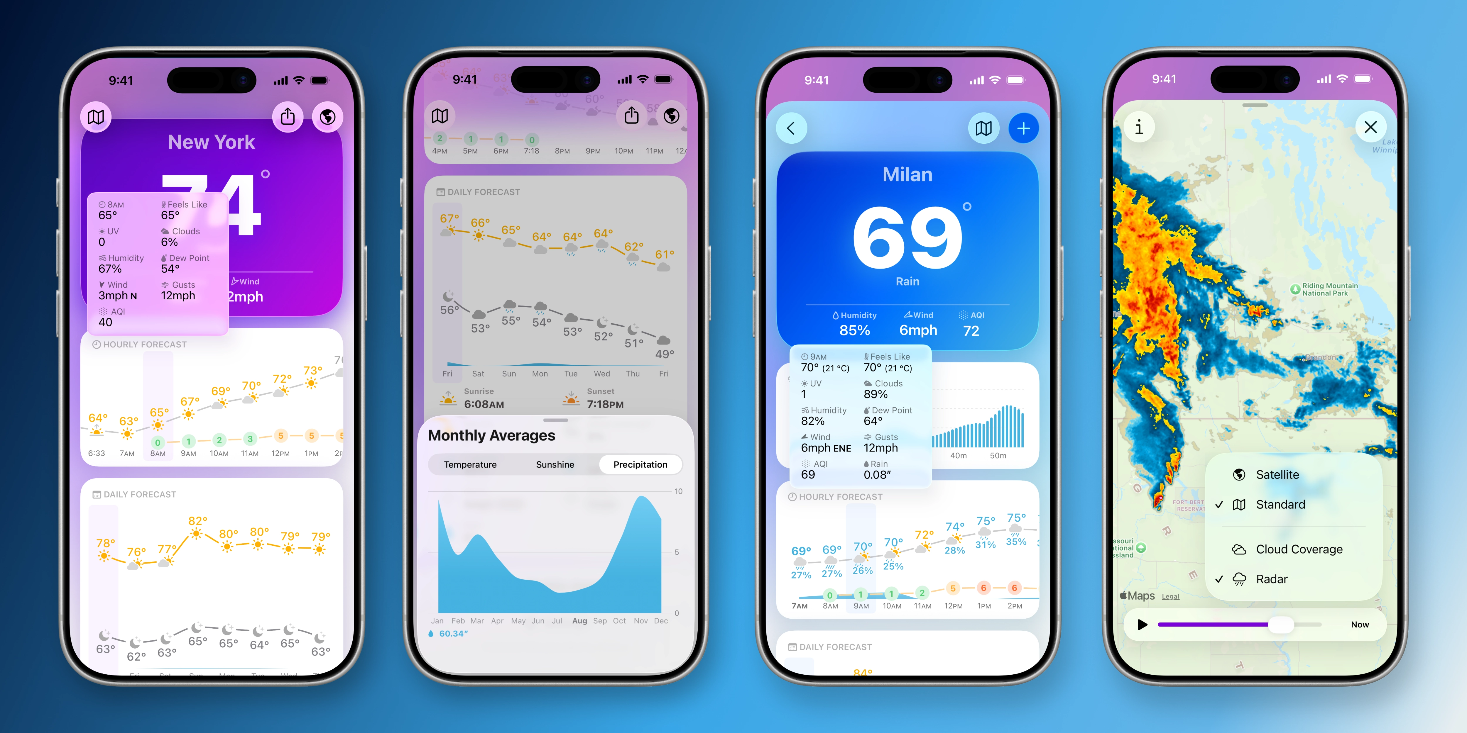 - iOS 18, iPadOS 18 & watchOS 11: Apart from the new dynamic app icons, we also brought the interactive widget to the Lock Screen and your watch face. With the new complication and widget, you can switch between the hourly and daily forecasts by tapping the forecast. We also added the brand new widget group with temperature, UV, and humidity to the Smart Stack. As part of the update, we also improved a lot of the chart interactions; gestures trigger faster and give better haptic feedback.