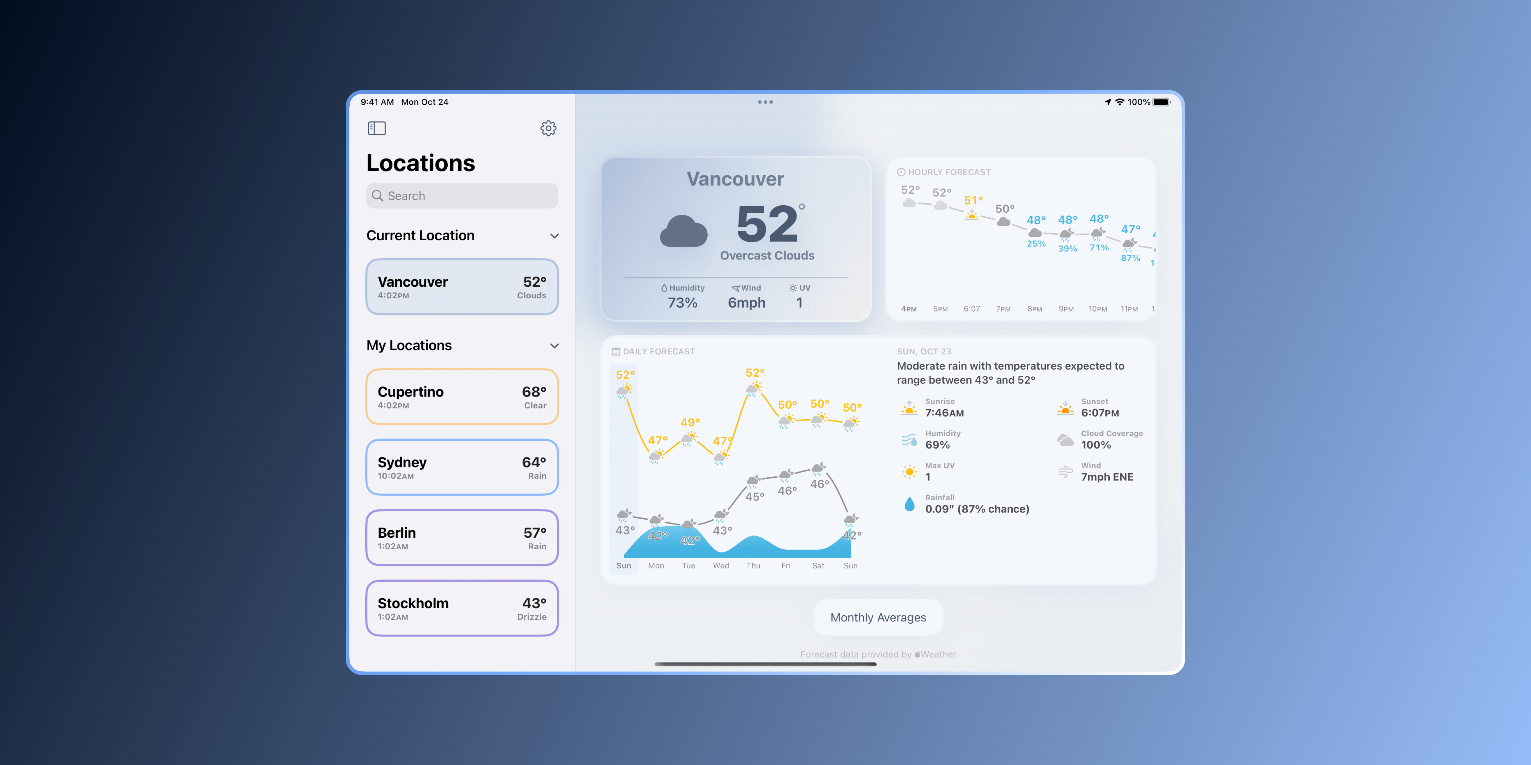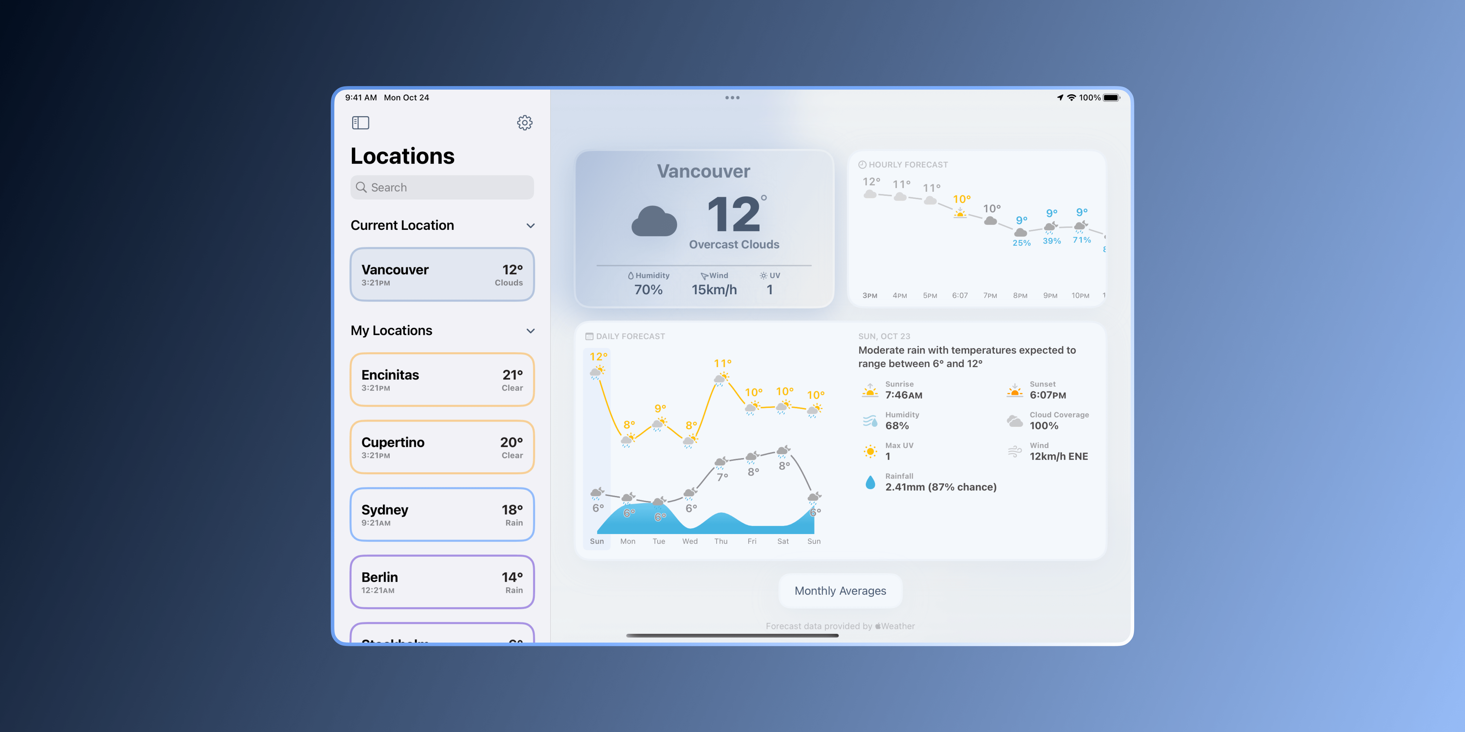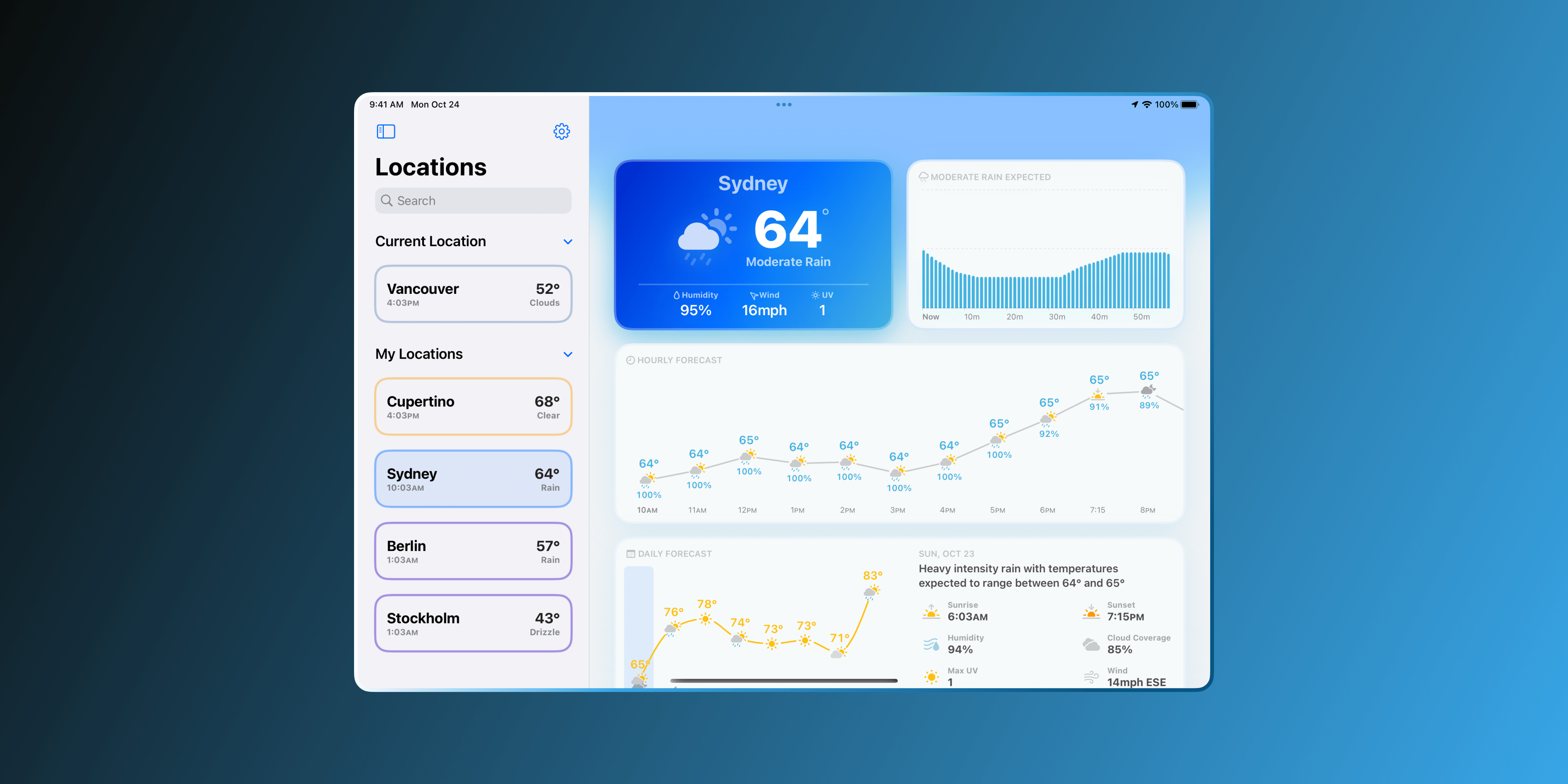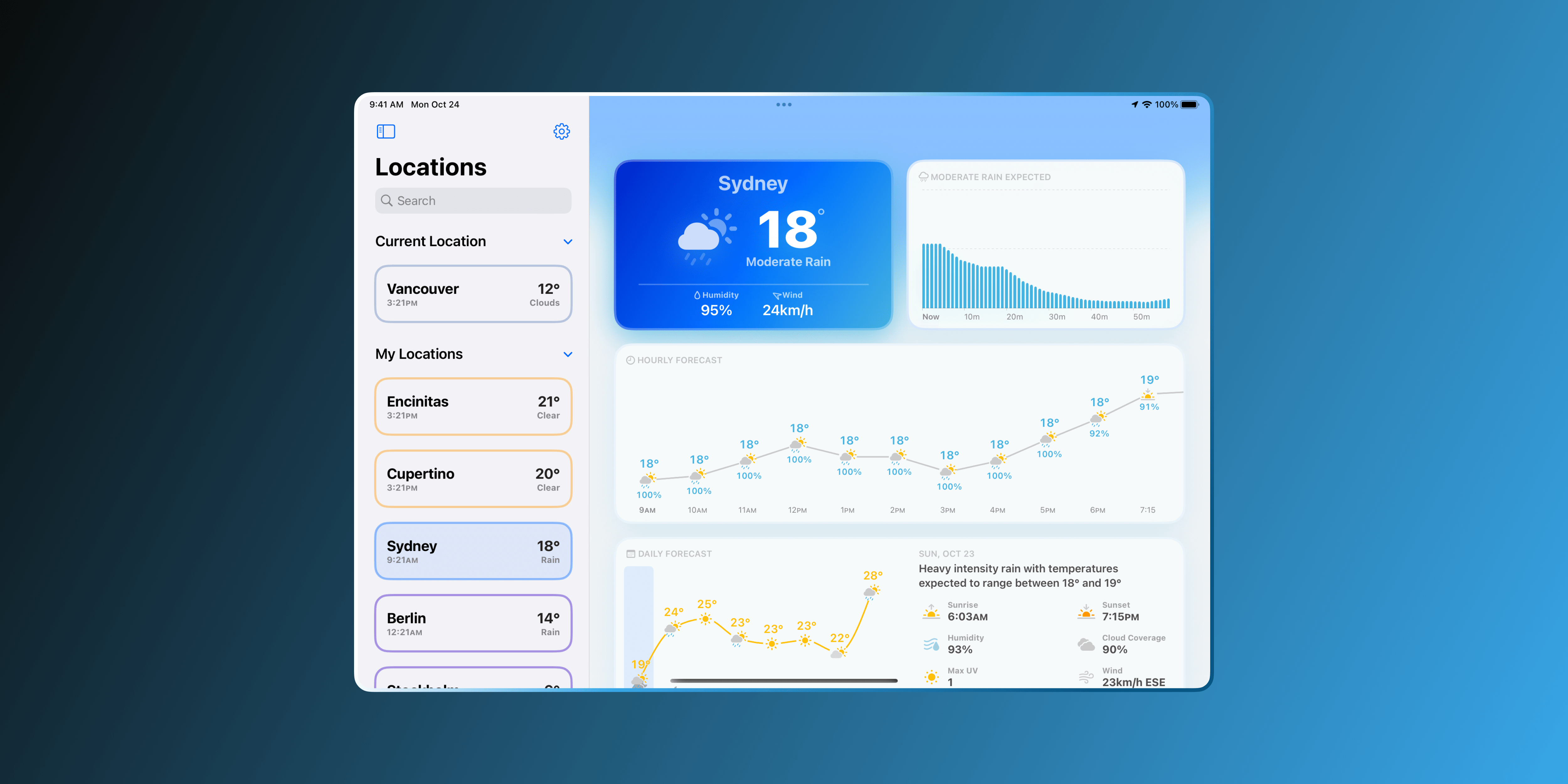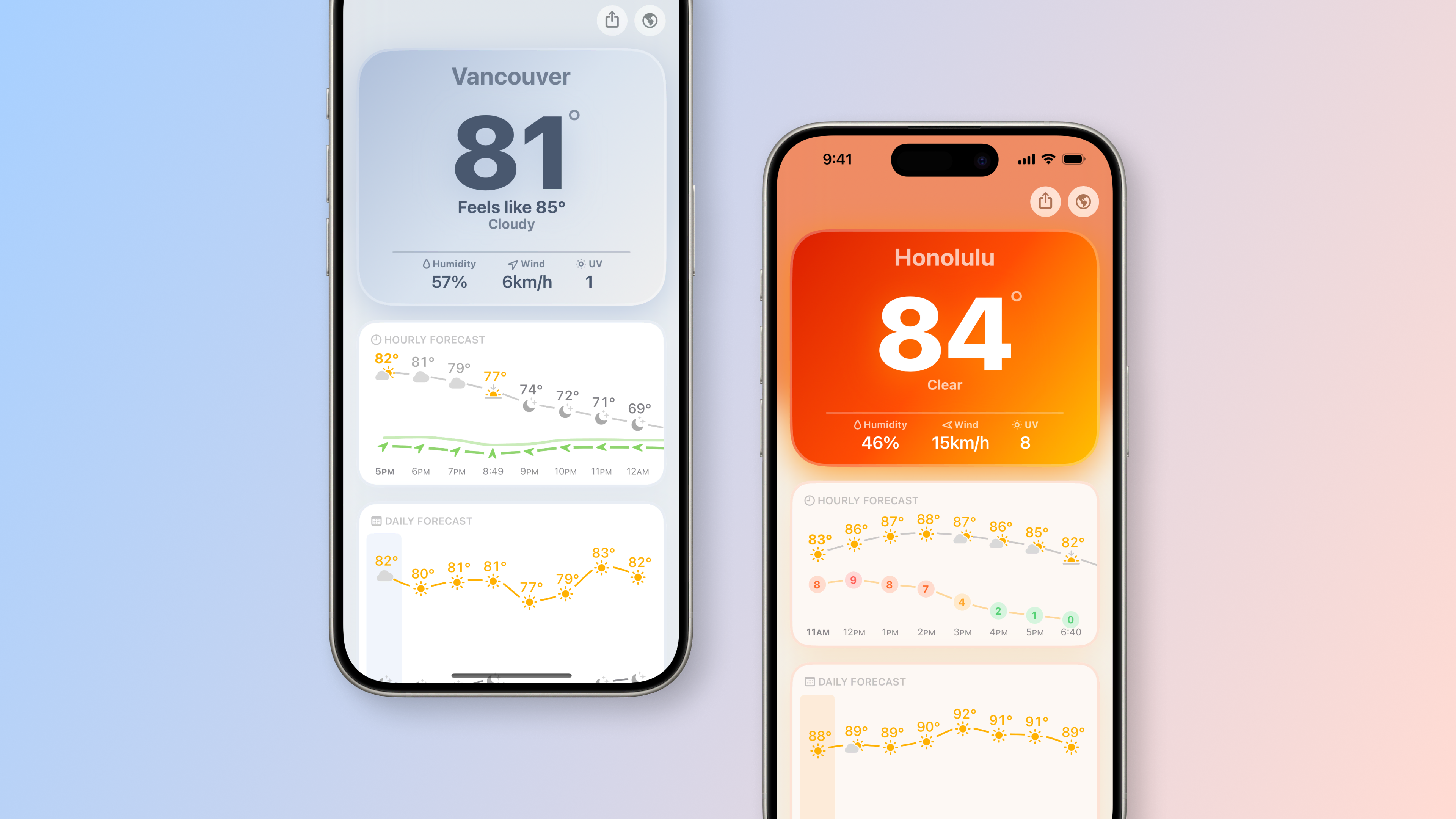 - iOS 18, iPadOS 18 & watchOS 11: Apart from the new dynamic app icons, we also brought the interactive widget to the Lock Screen and your watch face. With the new complication and widget, you can switch between the hourly and daily forecasts by tapping the forecast. We also added the brand new widget group with temperature, UV, and humidity to the Smart Stack. As part of the update, we also improved a lot of the chart interactions; gestures trigger faster and give better haptic feedback.