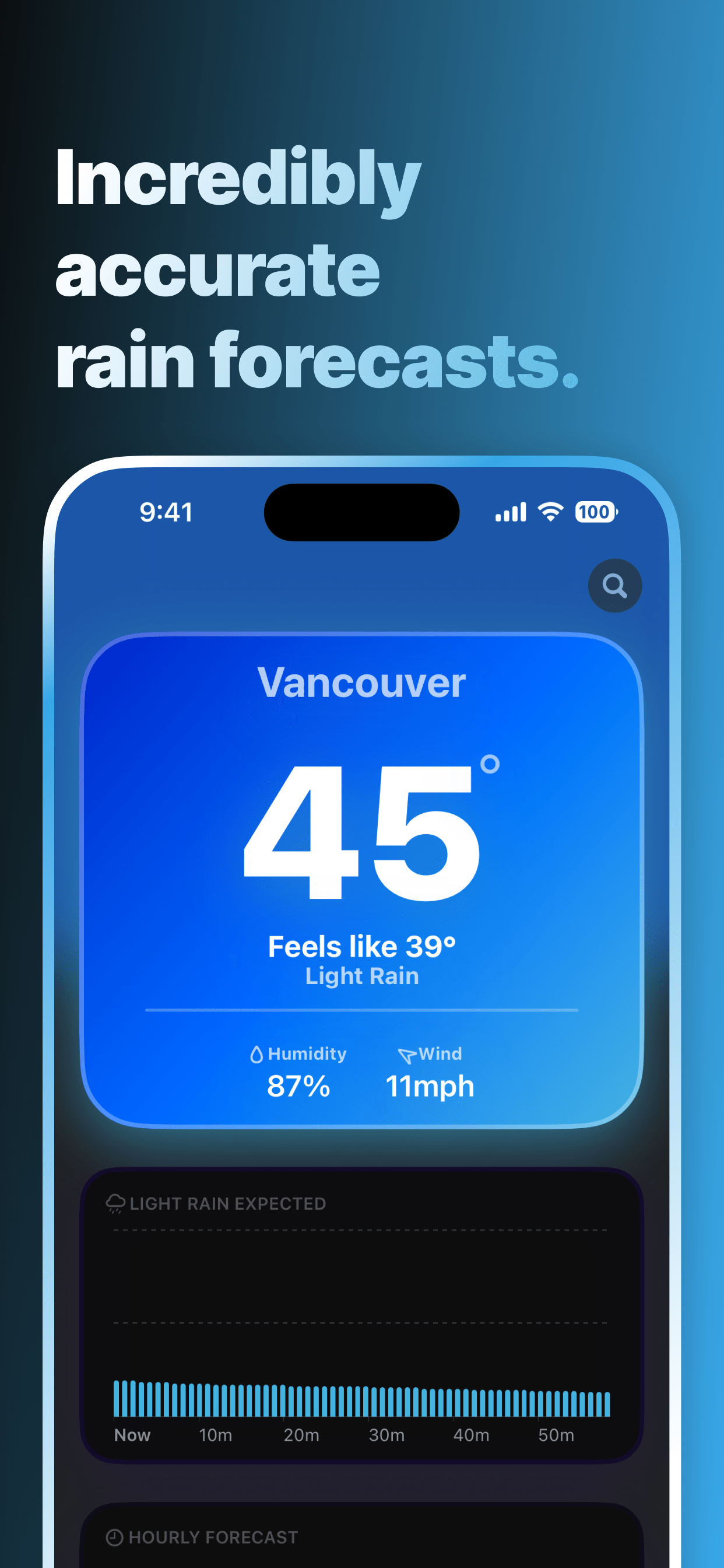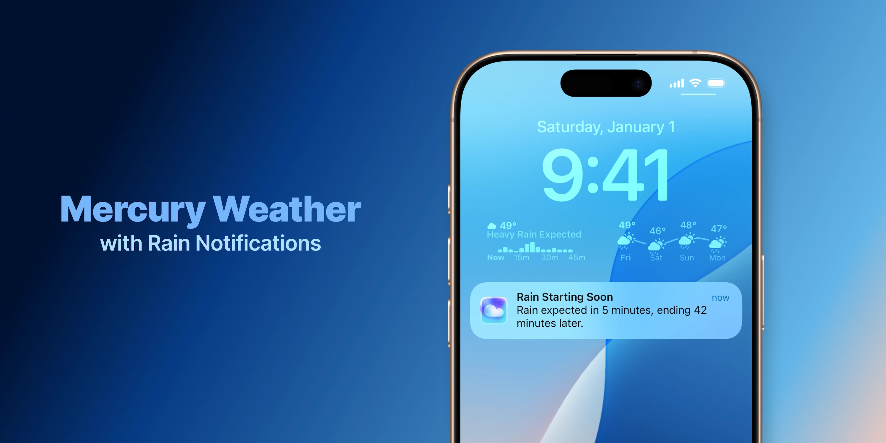 - Notifications: Weather notifications are finally here! We have all the basics, like super precise minute-by-minute rain and snow notifications, and notifications for severe weather warnings. We also added a bunch of neat touches. Mercury will send follow-up notifications if the precipitation forecast changes and will look ahead to estimate whether it's a short shower or rain for the rest of the day.