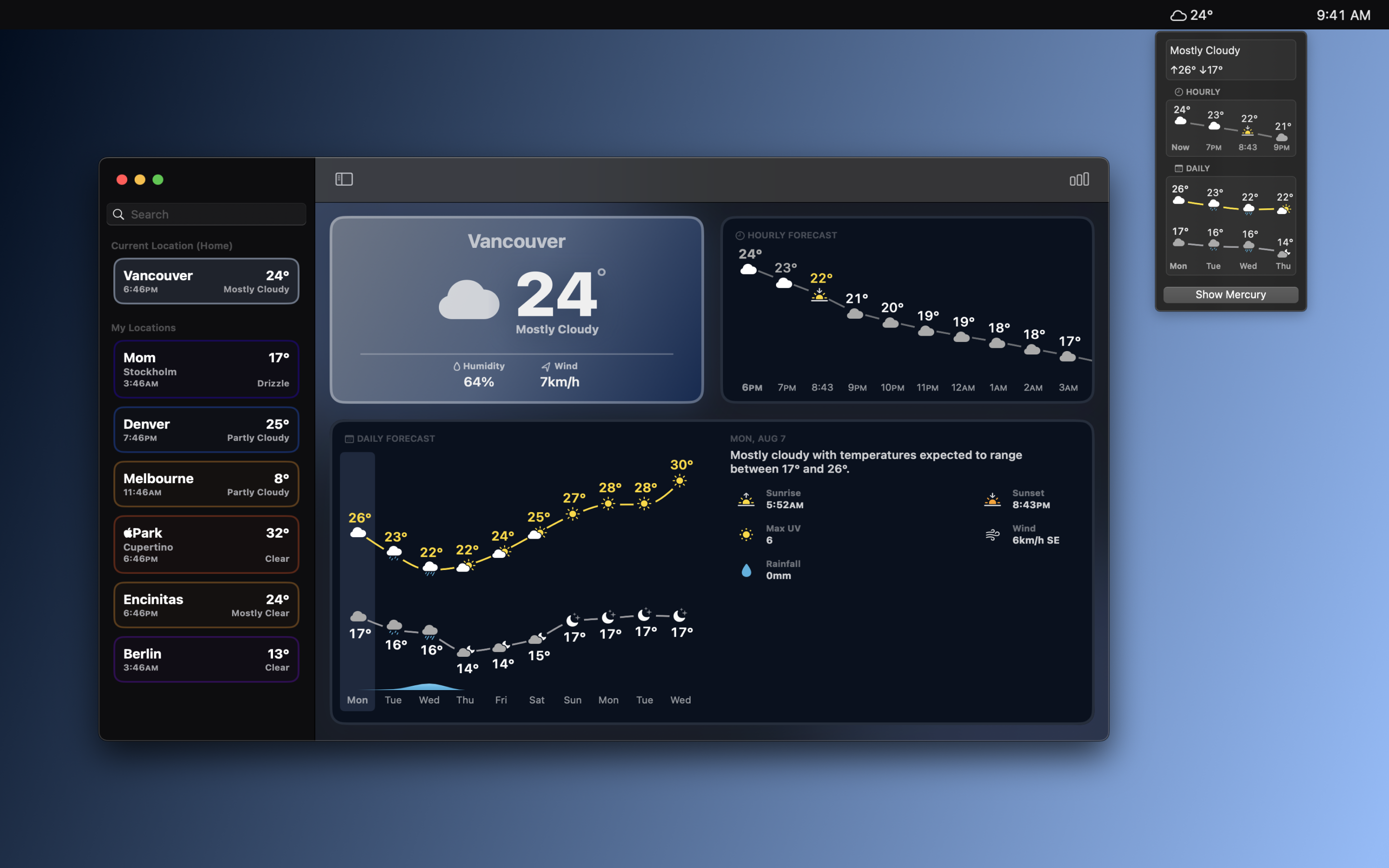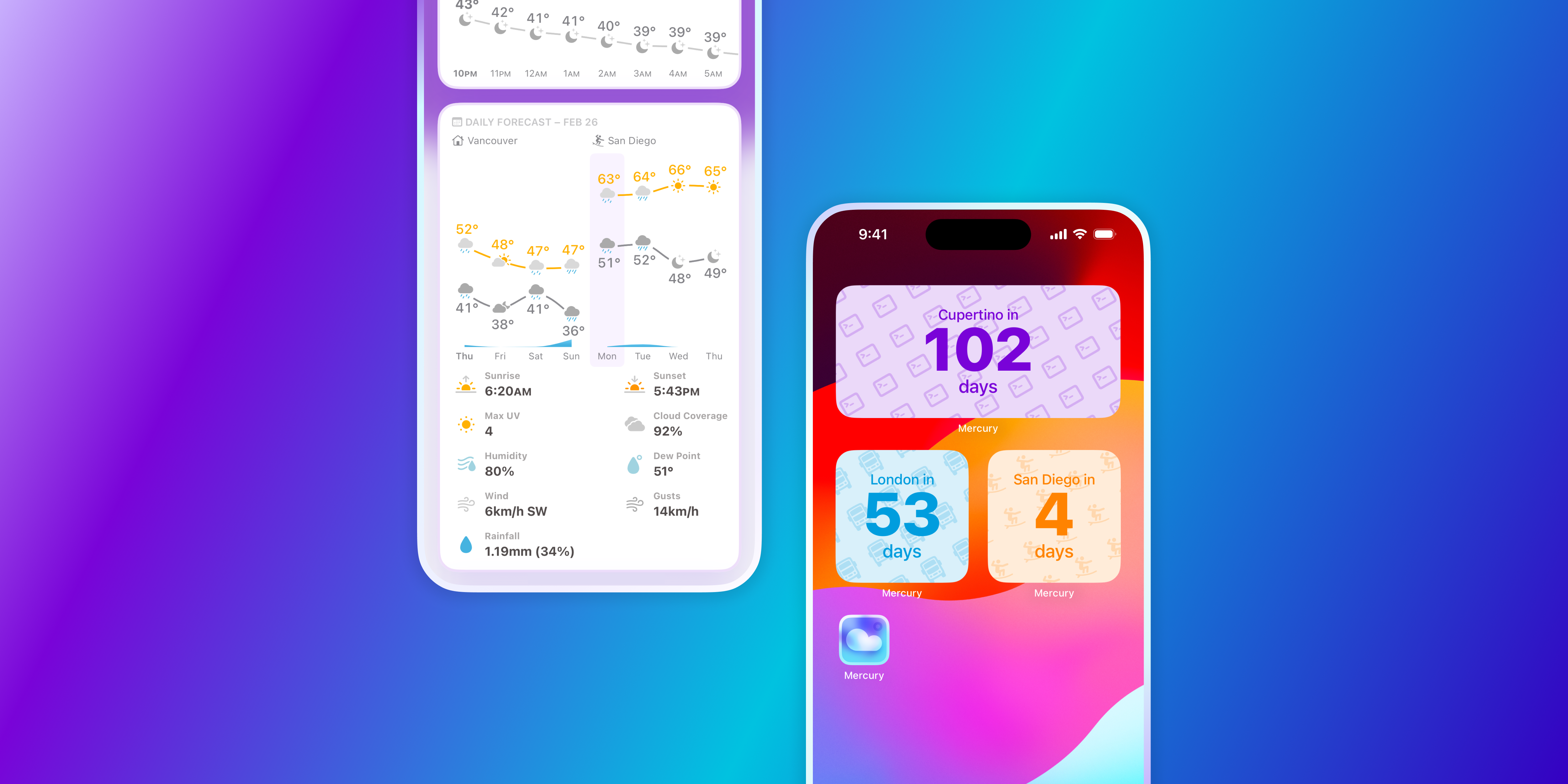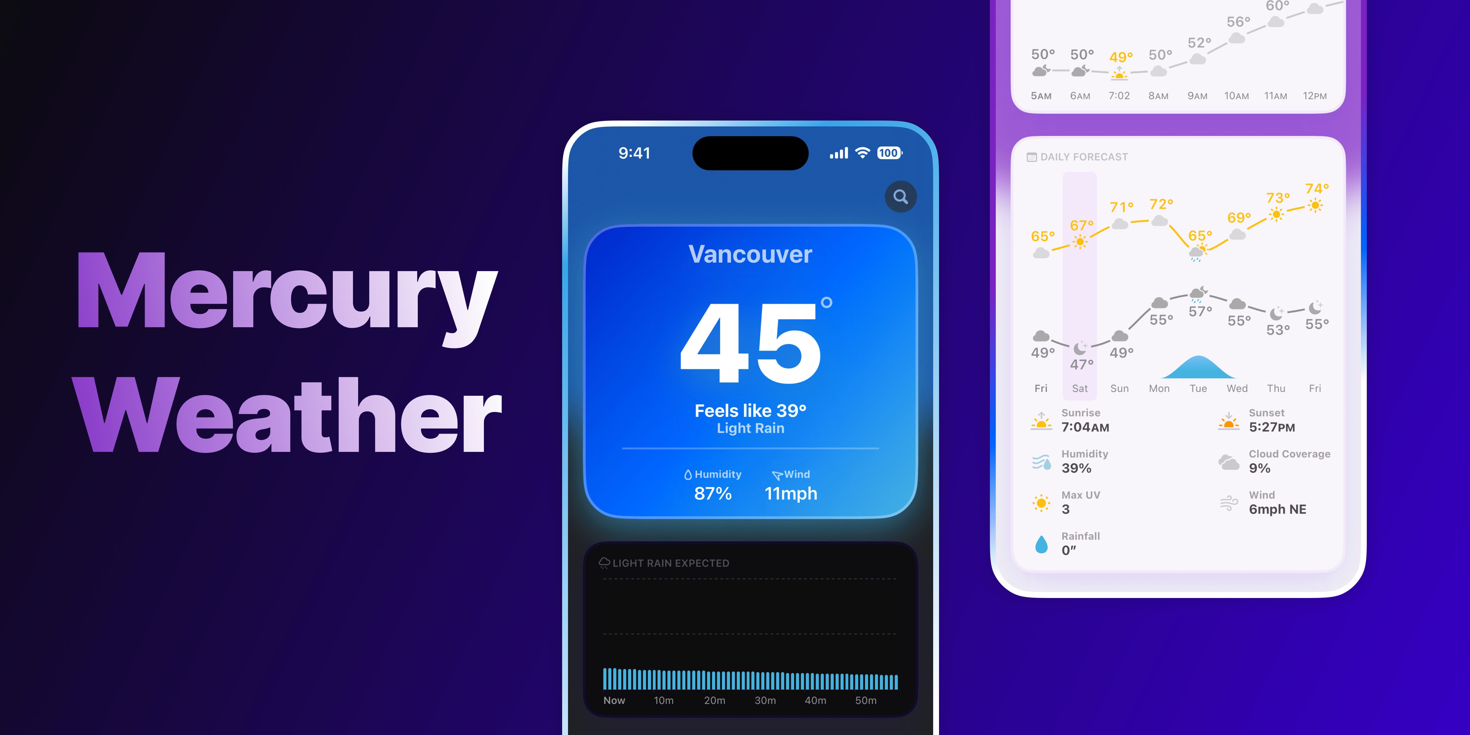 - UV and Air Quality Forecasts: Mercury now includes a 24-hour UV forecast chart, accessible from the UV label in the top current weather card. We also show air quality forecasts whenever the AQI is expected to reach moderate or higher levels.