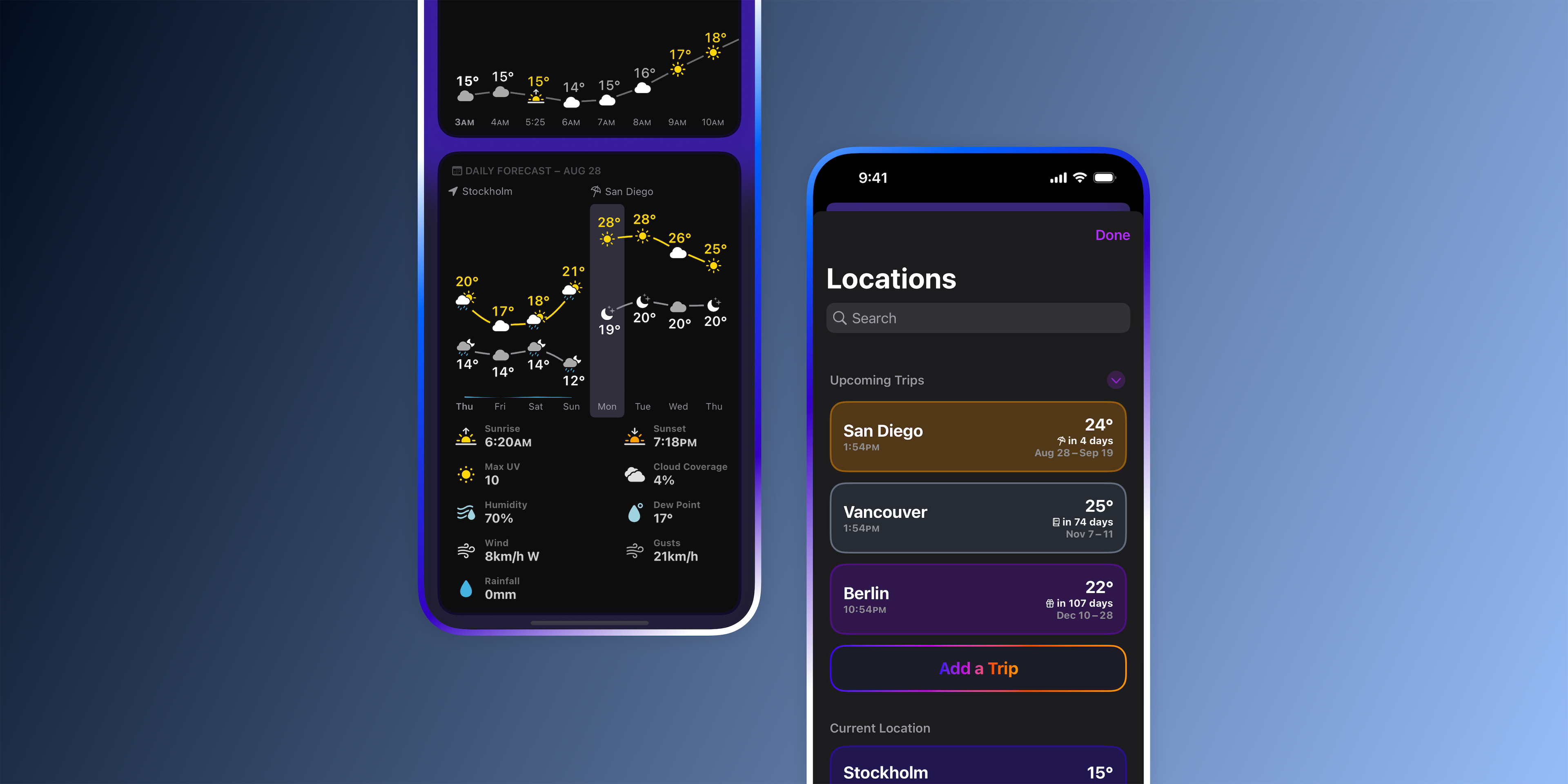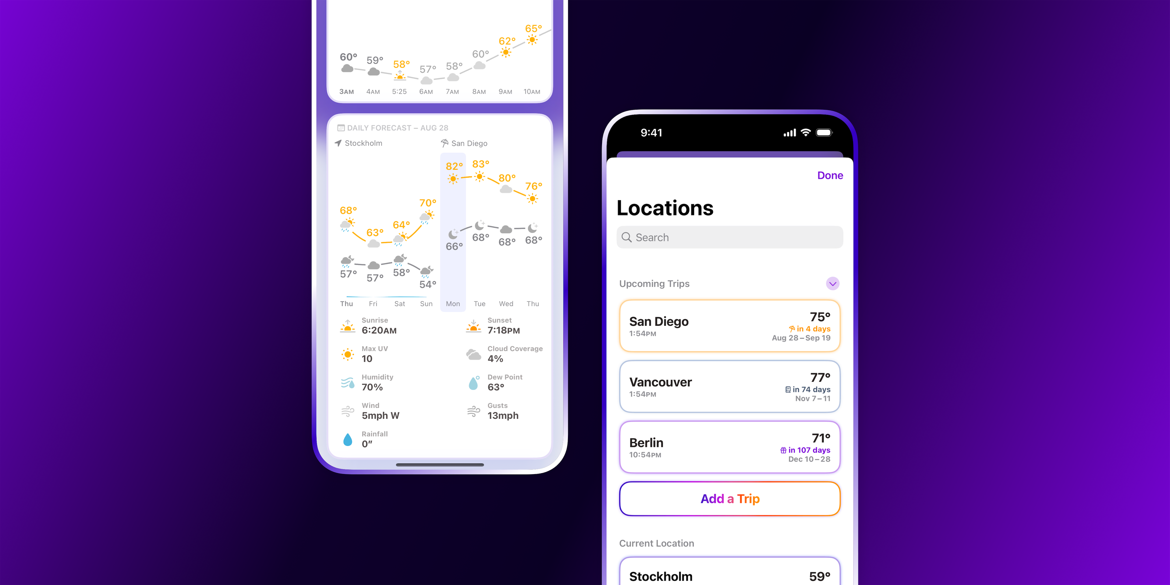 Trip Forecast is a feature that started (like so many) with the question, "How hard could it be?". With a trip coming up, we thought it was kind of silly that our daily forecast showed the weather for where we were right then rather than where we'd be during our trip. The plan was to quickly build the feature in a week or two… Fast forward a "brief" six months, and here we are, finally ready to ship it.