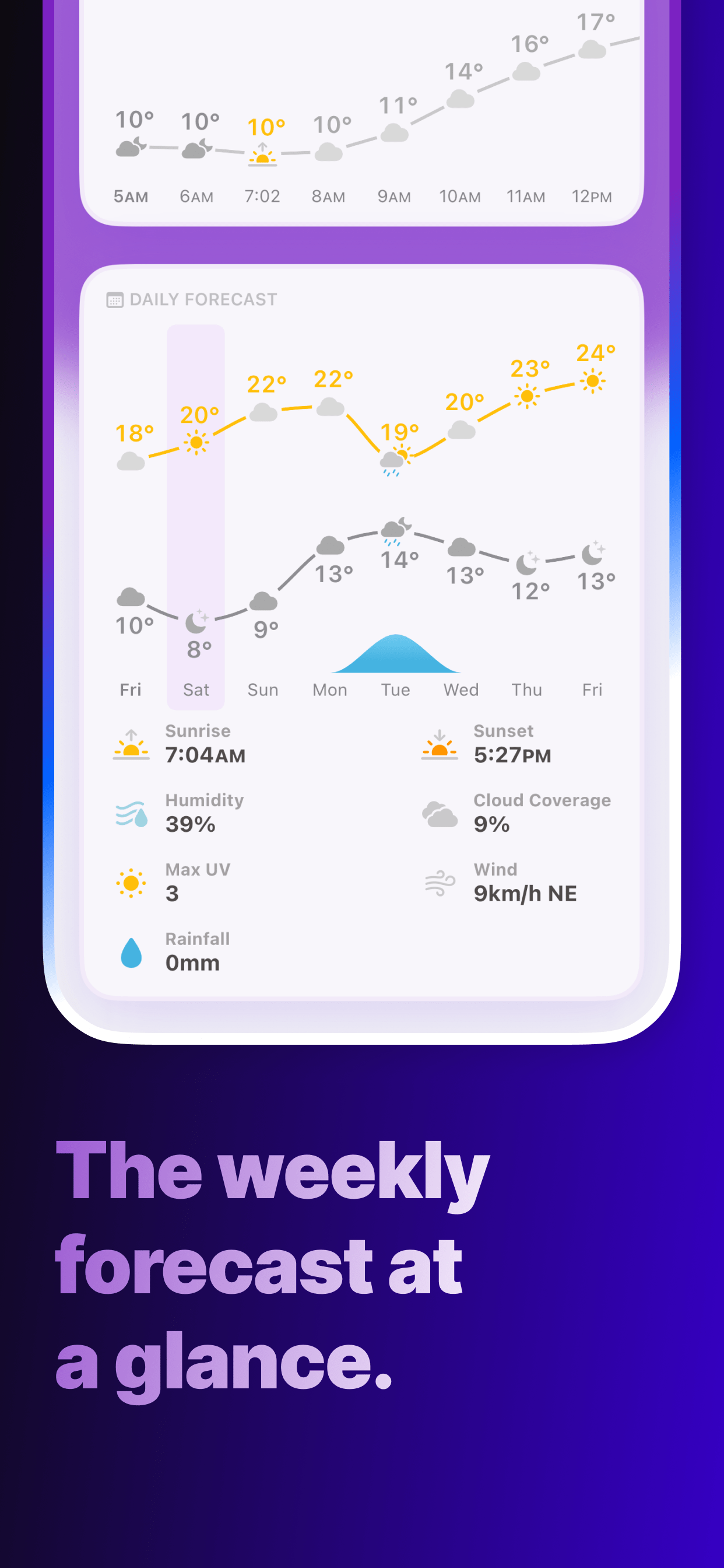 - Extra Hourly Data: You can now see the precipitation amount right in the hourly chart. And if that's not enough, you can also add UV or wind & gust as well. On top of that, you can also tap and hold any hour and see all the essential details in a neat new details bubble.