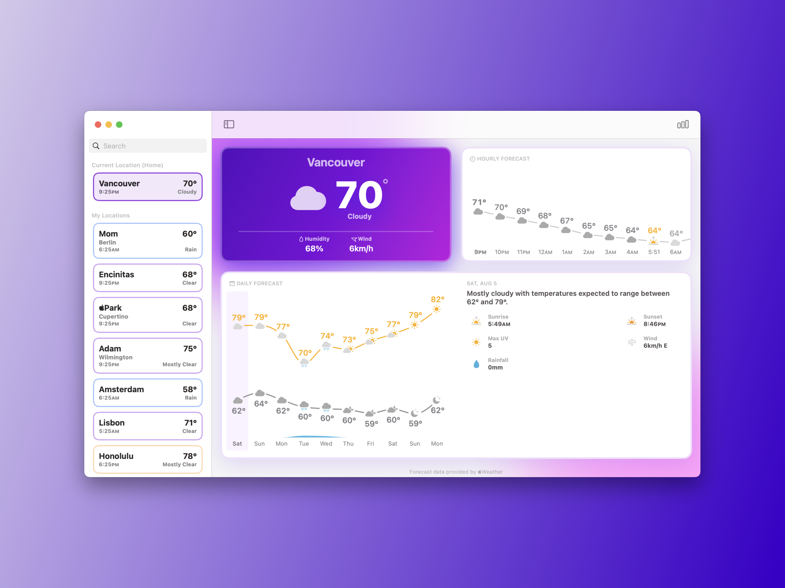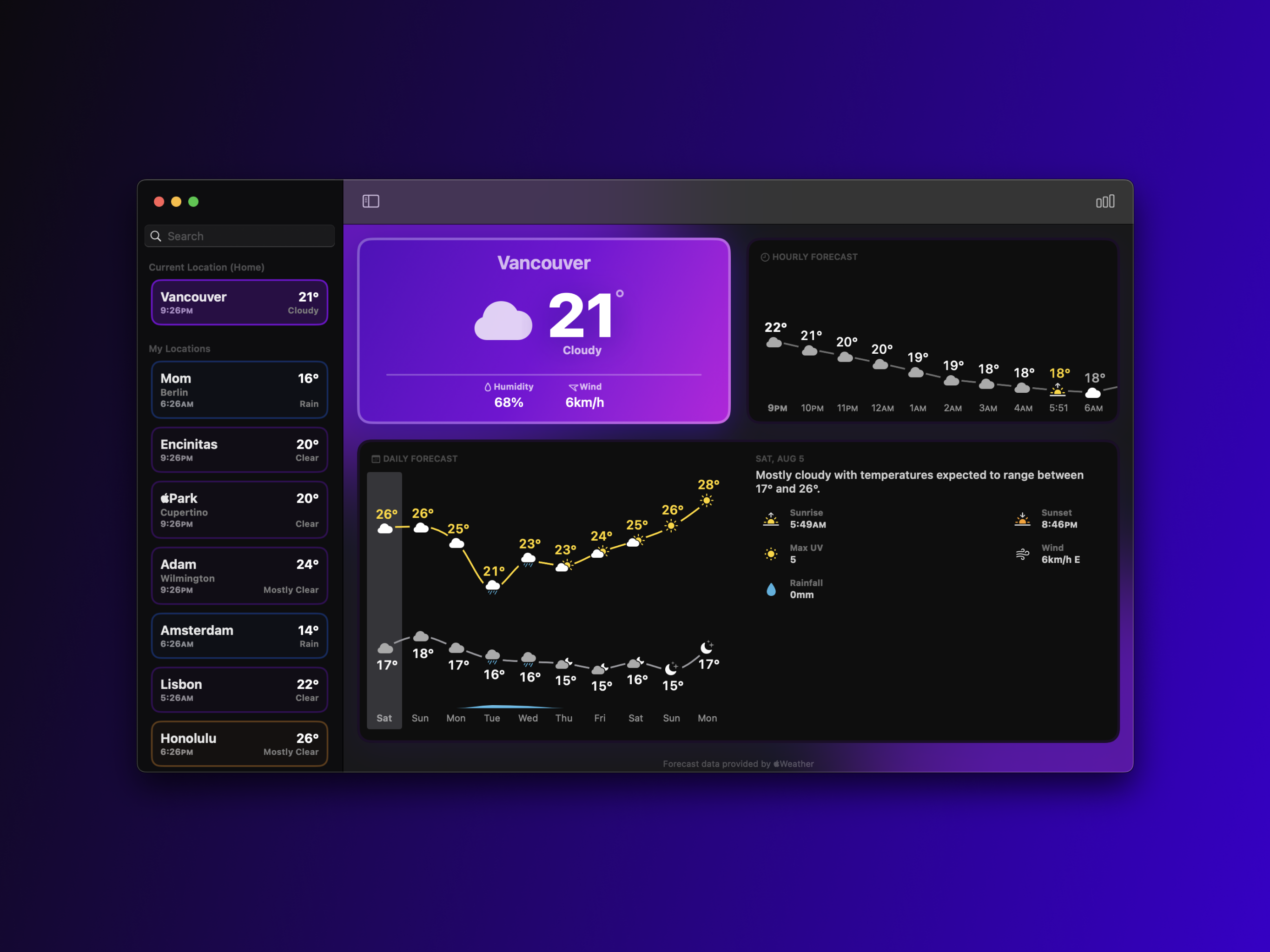 - New Data Provider: We added a new weather data provider. Welcome Foreca! Foreca is consistently one of the best-performing weather data providers in the world, and now they're an option in Mercury. In fact, they're the default dynamic option for most locations worldwide (even for free users). But premium users can still pick their favorite one in settings, of course.